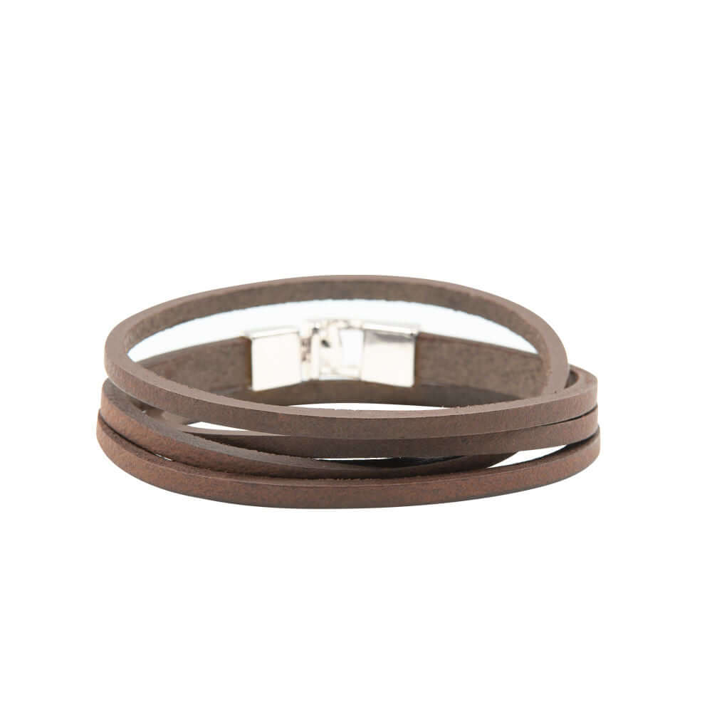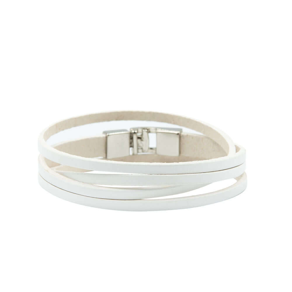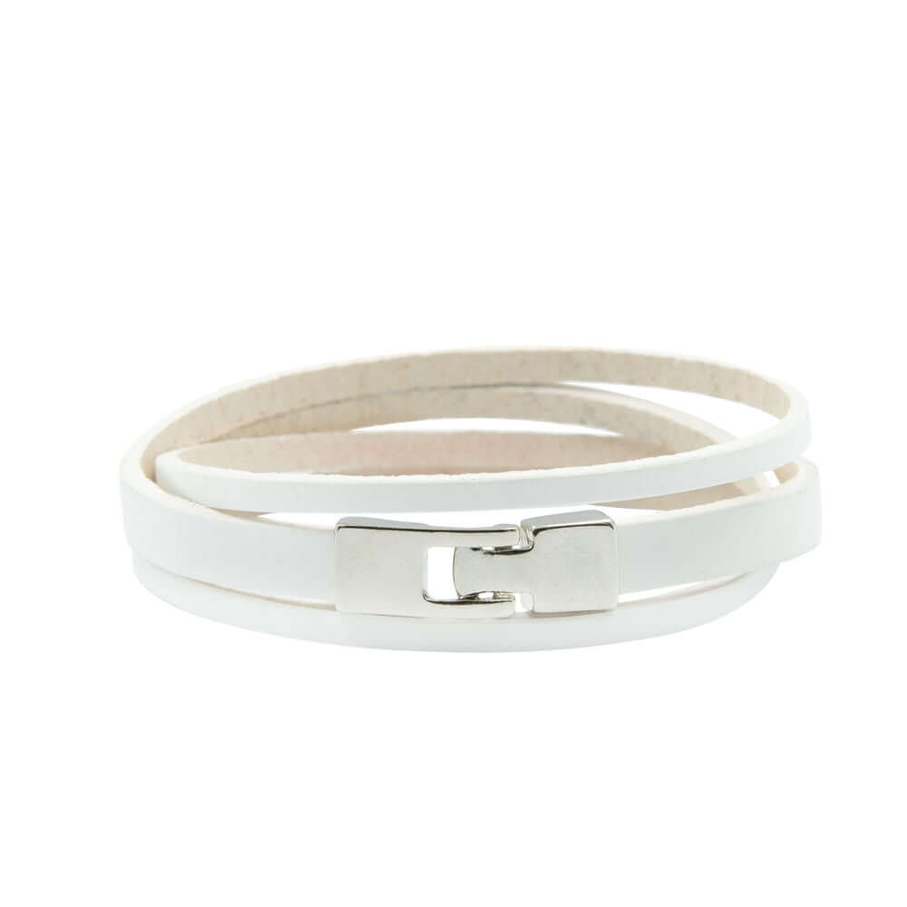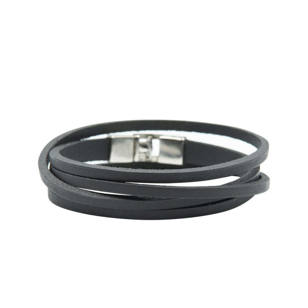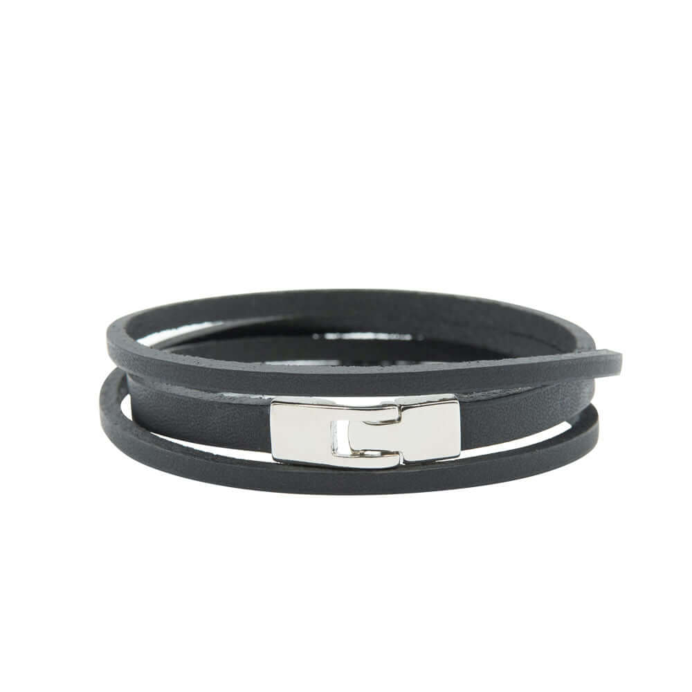This double wrap slit leather bracelet features a silver-tone T-bar hook clasp for secure and stylish closure. Its clean silhouette and minimal hardware make it an easy everyday piece — whether worn solo or layered.
